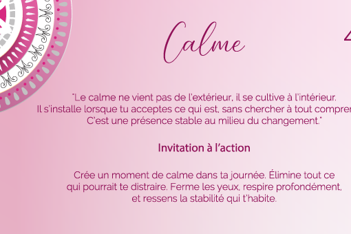 « Le calme ne vient pas de l’extérieur, il se cultive à l’intérieur. Il s’installe lorsque tu acceptes ce qui est, sans chercher à tout comprendre. C’est une présence stable au milieu du changement. »