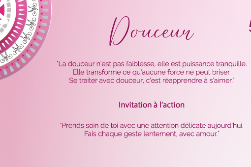 « La douceur n’est pas faiblesse, elle est puissance tranquille. Elle transforme ce qu’aucune force ne peut briser. Se traiter avec douceur, c’est réapprendre à s’aimer. »