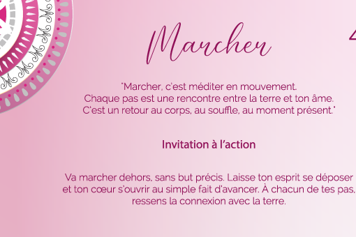 « Marcher, c’est méditer en mouvement. Chaque pas est une rencontre entre la terre et ton âme. C’est un retour au corps, au souffle, au moment présent. »