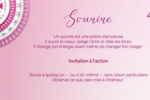 « Un sourire est une prière silencieuse. Il ouvre le cœur, allège l’âme et relie les êtres. Il change ton énergie avant même de changer ton visage. »