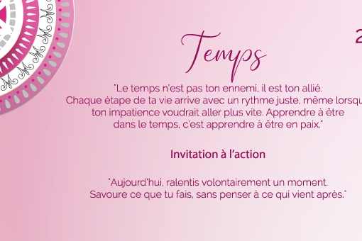 « Le temps n’est pas ton ennemi, il est ton allié. Chaque étape de ta vie arrive avec un rythme juste, même lorsque ton impatience voudrait aller plus vite. Apprendre à être dans le temps, c’est apprendre à être en paix. »